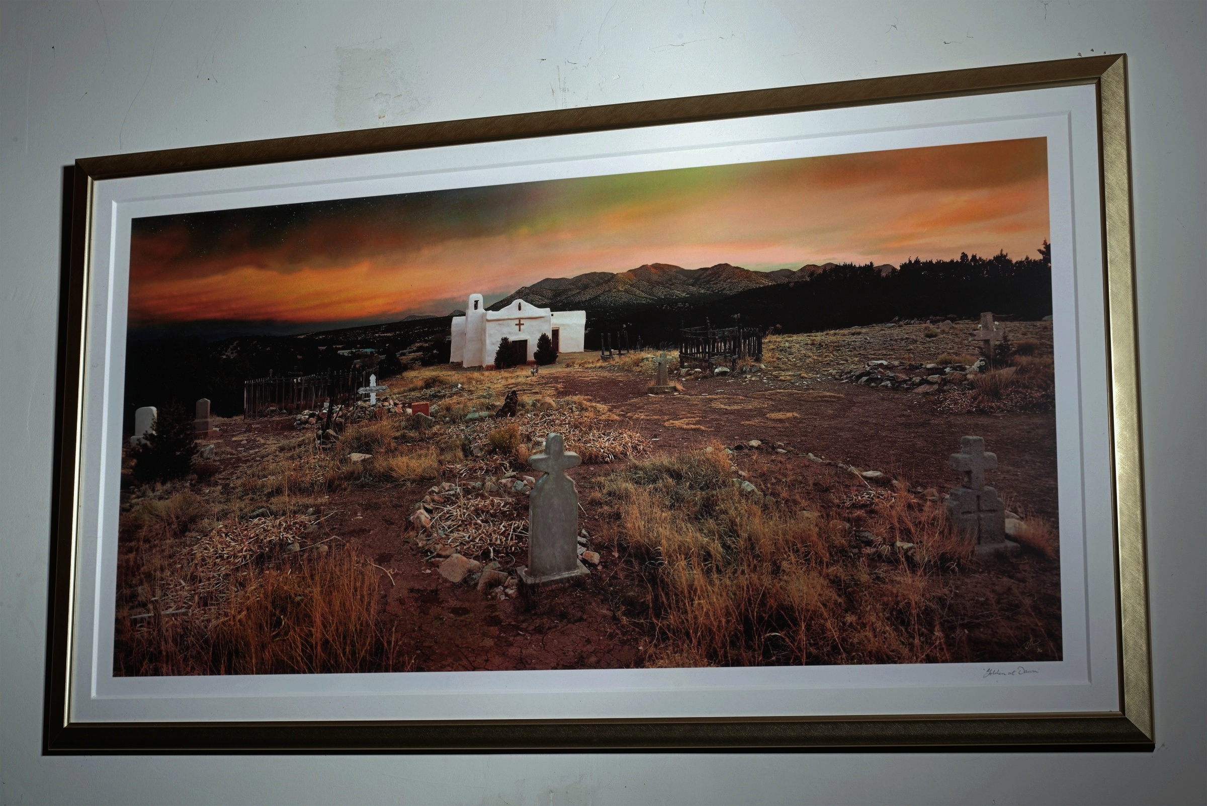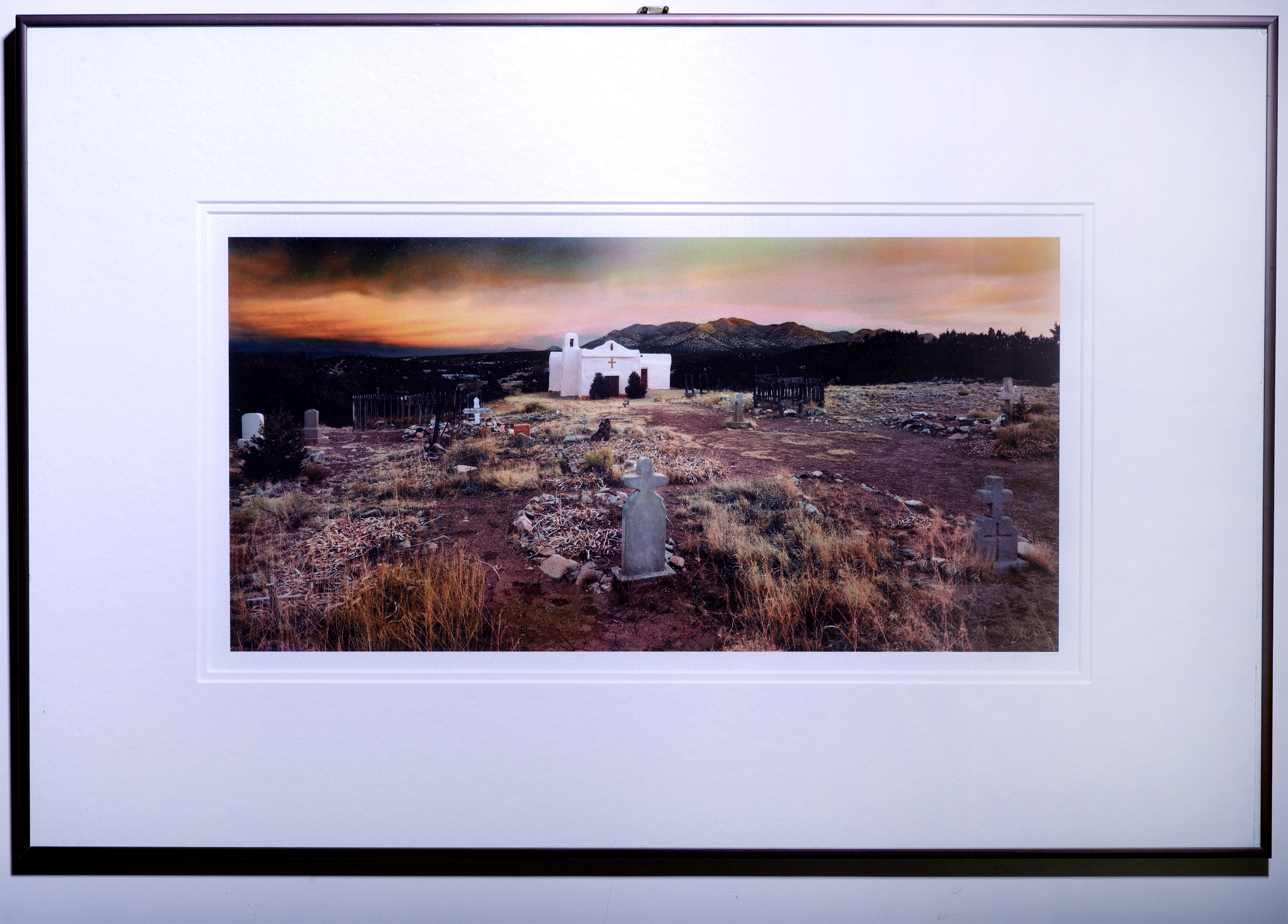 Update: I only made two 20×40 ‘tin’ frames (tin-plated steel actually) and one sold 2016 for $1500. The remaining one is $2500. I consider it my ‘master’ print as I adjust all other prints by its color and almost 3D effect. I do have unframed ‘gallery wrapped’ and fine art paper versions. The first one pictured below $400, double matte, 10×20. The second is a 20×40 print, $800, with extra-heavy acid free matte and a glare resistant plexiglass lite. The framing materials are very expensive. I have a museum UV glass version, unmatted for $600. The third print is with a classic wooden frame, 7×16 inches. I only have two, one double matte and the other triple matted. Those are $300 each.