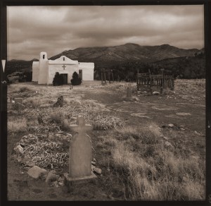 Here is an older photo, taken during a Thanksgiving trip to my parents’ house in Santa Fe. The sky was overcast and then the sun peeked through lighting the church. Taken with a Mamiya C330 twin lens medium format camera.