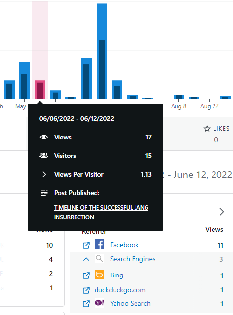 In the screenshot posted below, you see a dramatic increase in my traffic and organic results from multiple search engines (Google blocked me a long time ago). Then, the week of June 6, when I posted a fully-cited ‘narrative’ on January 6th, all organic search results ended . . . zero since then . . . and posts to my feed are ‘suppressed’ by FB until November 8th . . . Election Day.