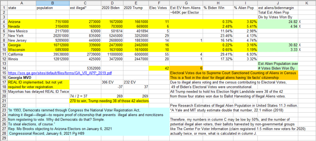 So, when Trump lost 2020 by 56 Electoral Votes, GA, AZ, WI, and NV alone, flipped by harvesting of illegal alien votes accounted for 43 . . . leaving only 13 . . . New Mexico, with 5 Electoral Votes, issued 100,000 drivers’ licenses to illegal aliens. Did the ‘legal’ ballot harvesters use MVD databases to solicit absentee ballots? Democrats had 153,000 more mail ballots than Republicans, Biden winning by 99,720 votes. That left Trump only 8 Electoral Votes to go . . . If you add the Electoral Votes favoring Democrats through the census, that’s 4 or 5 for California, and 1 each for New York, New Jersey, and Illinois. There’s your eight right there.
