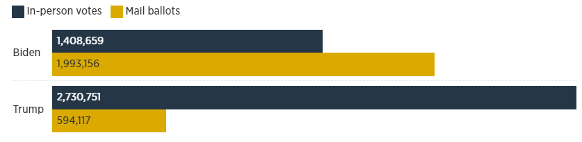 In 2020, mail ballots in Pennsylvania and New Mexico increased from 20% to 40% of the total vote. In Pennsylvania, Trump’s massive election night lead with 2X Biden’s votes included a normal 20% vote by mail, consistent with previous elections. However, a week later, Biden’s 1.2% victory result was due to 60% of his ballots being by mail counted after Election Night. In New Mexico, Democrat use of the mail ballot was also 3X that of Republicans; about 234,000 mail ballots, which were 153,000 more than Republican’s at only 82,000. Biden won New Mexico by 100,000 votes.[16]