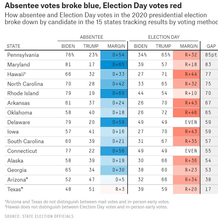 Note, that while Trump led on Election Night with 2X Biden’s votes, days of ‘counting’ mail ballots flipped 2020 to Biden by 1.2%. While Trump’s mail ballots were consistent with previous elections, Biden’s mail ballots were 60% of his vote.