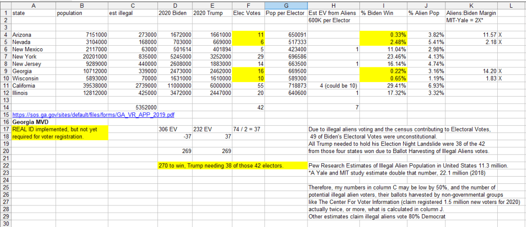 Trump only needed 38 Electoral Votes to preserve his Election Night landslide; these four states accounted for 42 electors. Three of them had Trump ahead by 2X, but flipped by less than ½ of a percent. How many of those 77,000 votes were ballots harvested from illegal aliens? Consider that at least 850,000 illegal aliens are estimated living in those four states.