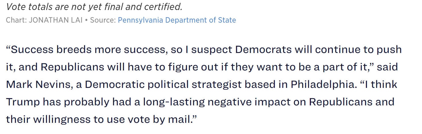 In New Mexico, promotion of mail absentee ballots by Democrats, thanks to their 2018 Absent Voter Act, doubled mail ballots from 20% to 40% of the vote. Again, like Pennsylvania, while Republican mail ballots were consistent with previous elections, Democrats got 3X as many. 235,000 (D) to 83,000 for Republicans, a difference of 152,000; Biden won New Mexico by 99,720 votes.